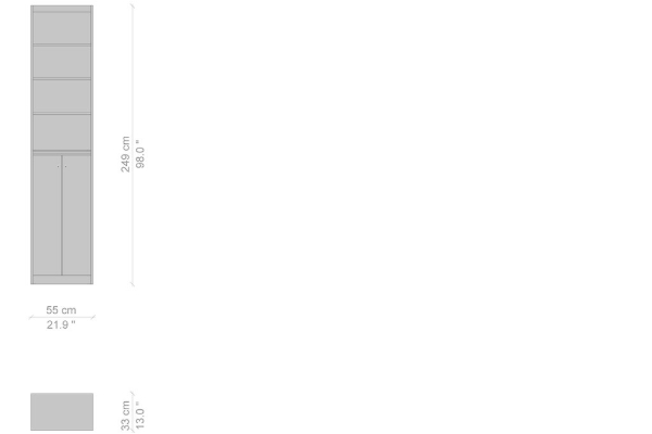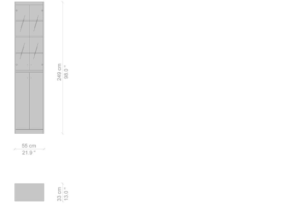 Cassina's Rialto Cabinet comes in four versions and measurements: a single unit of the Rialto measures 22x55x249 cm or 33x55x249 cm. The double version comes in 22x114x249 cm. A three-unit variant will measure 22x173x249 cm, while a four-unit cabinet with doors measures 22x232x249 cm. Regardless of measurements, the Rialto can occupy any vertical plane within your home. This cabinet system gives any area a beautiful and efficient storage solution that will add a touch of practicality and style to the location that it inhabits.
