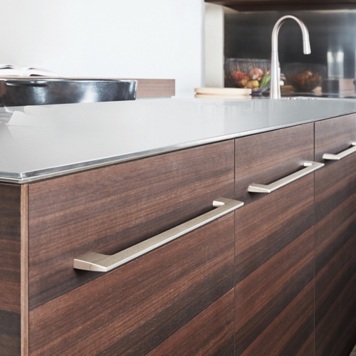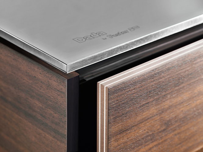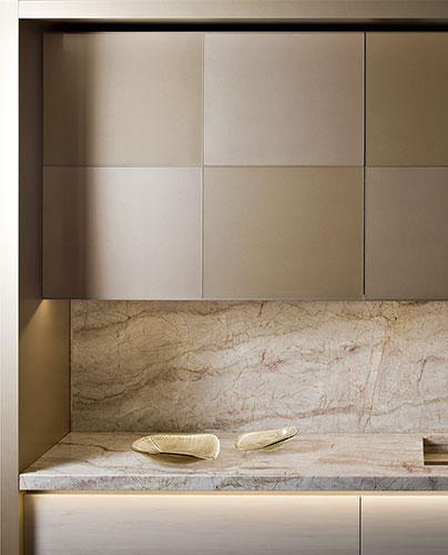 As a representative solution, Checkers designed by Armani and produced by Dada an Italian Kitchen manufacturer, is ideal as it is an exquisite open kitchen. Here, the natural stone top combines with precious natural wood, exclusive lacquers, and back-painted, ridged, textured glass. An LED light in the base of the wall units and countertop emphasizes the exquisiteness of the materials and enhances their variegated textures.