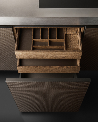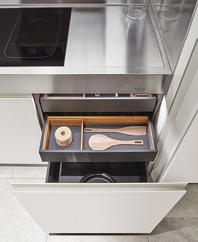 But a column can also be customized with accessories such as spice racks and jars, shelves with dividers for bottles and supports for glasses, pouches, and removable containers. Nothing is left to chance. Even the drawers can be organized in practical compartments to separate tools, cutlery and accessories.