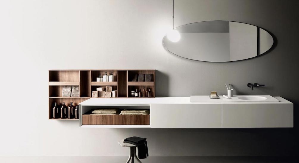 Hanging furniture, storage units, modular systems integrated with the washbasin are elements that integrate perfectly into the space to satisfy every kind of daily ritual.