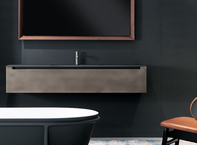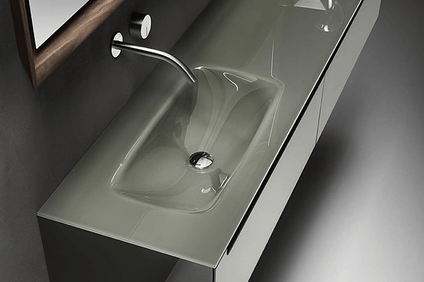 A total of thirty-five finishing selections are available for the Falper Edge Glass Bathroom Vanity. Twenty-four of these selections are glossy/satin glass with one gold leaf finish available only for the top. There are also five options for metal finishes as well as marble tops as well as a single wooden finish. The drawers are lacquered with Falper's Exclusive matte grey finish. The groove handles also have their set of finishes in onyx and brushed brass. These finishing options allow the Edge Glass to easily accommodate any interior design scheme for your restroom.