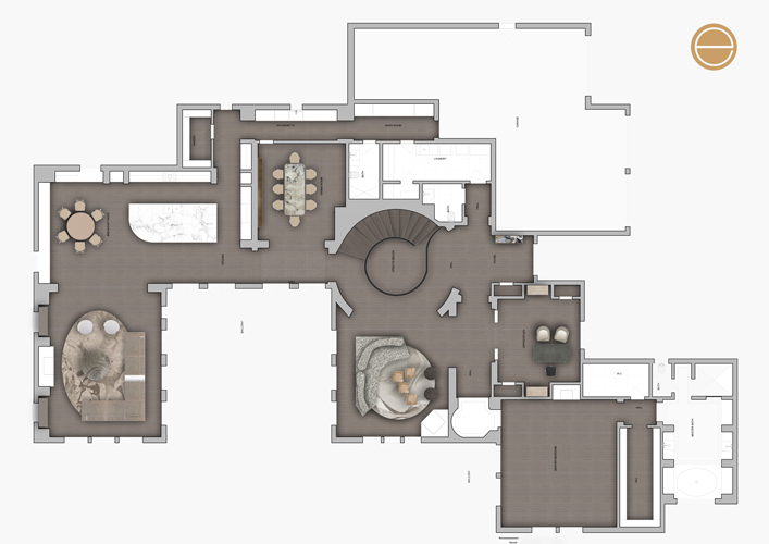 For the family room we therefore opted for a palette of shades of gray, making the Otto table, signed by Cornelio Cappellini, the true visual core of the room thanks to its swirling and eye-catching texture.