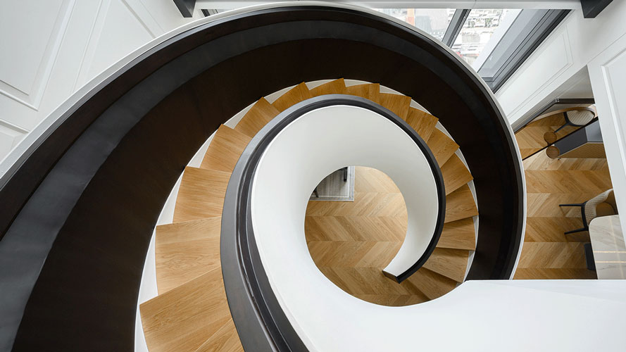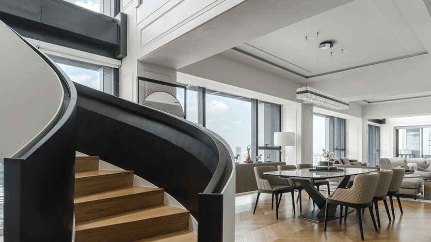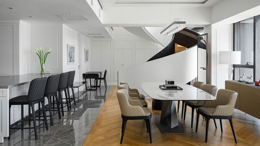 We enter the open plan via a winding and dynamically designed staircase and are greeted by the dining area, which precedes the living area and lounge area.
