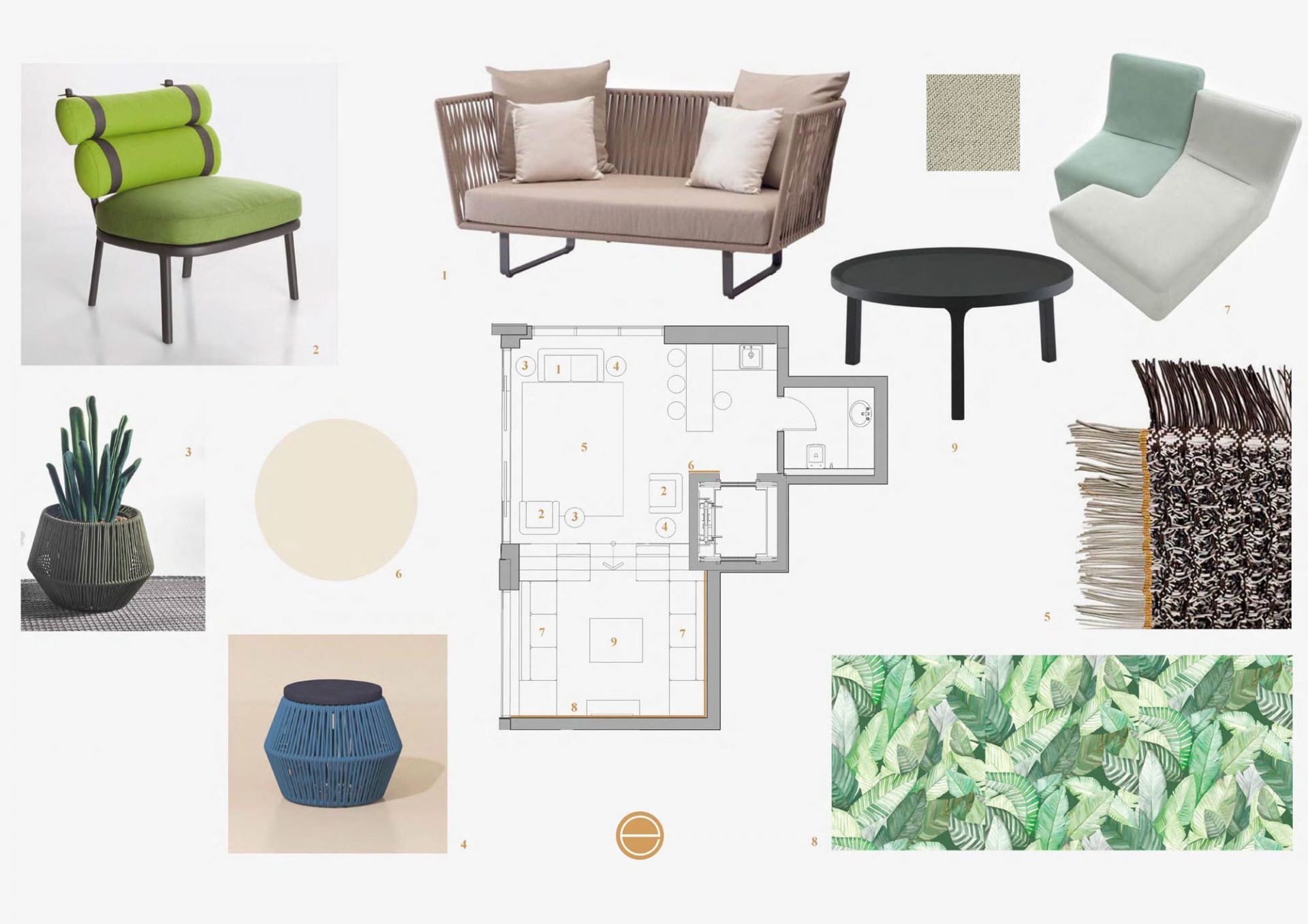 For the poolside area, our interior decorator chose designer furniture pieces with a minimalist style and soft colors, in particular, white and juniper green sunbeds and side tables from Kettal. The sunbeds feature an aluminum structure and fabric upholstery.