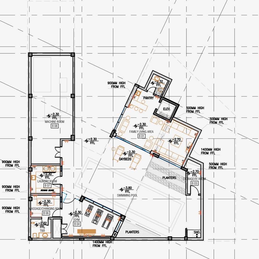 Our project began at the basement level, where the main element is a large indoor pool. This sizable enclosed space is where the family can relax and entertain their guests. On the same floor, there are also a furnished lounge area, a gym, and a massage room.