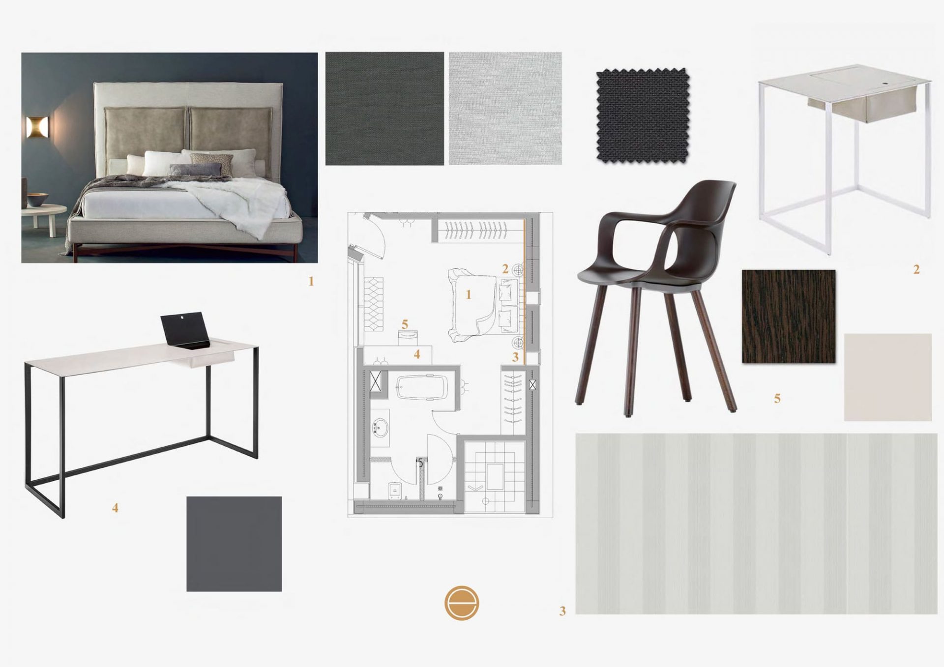 Regarding the furniture, our designers chose an understated and elegant bed with sand-colored upholstery and the 4040 bedside tables by Molteni&C in grey oakwood. Next to the bed is a niche that livens up the floor plan of the room. Our designers personalized this little corner space with a beige colored bench with capitonné finish and moka legs.