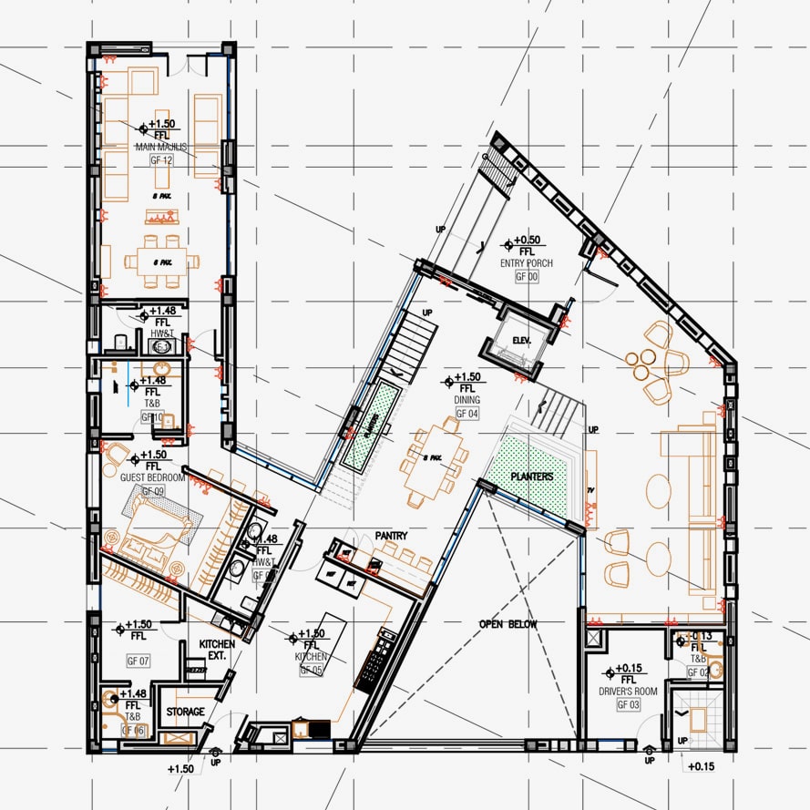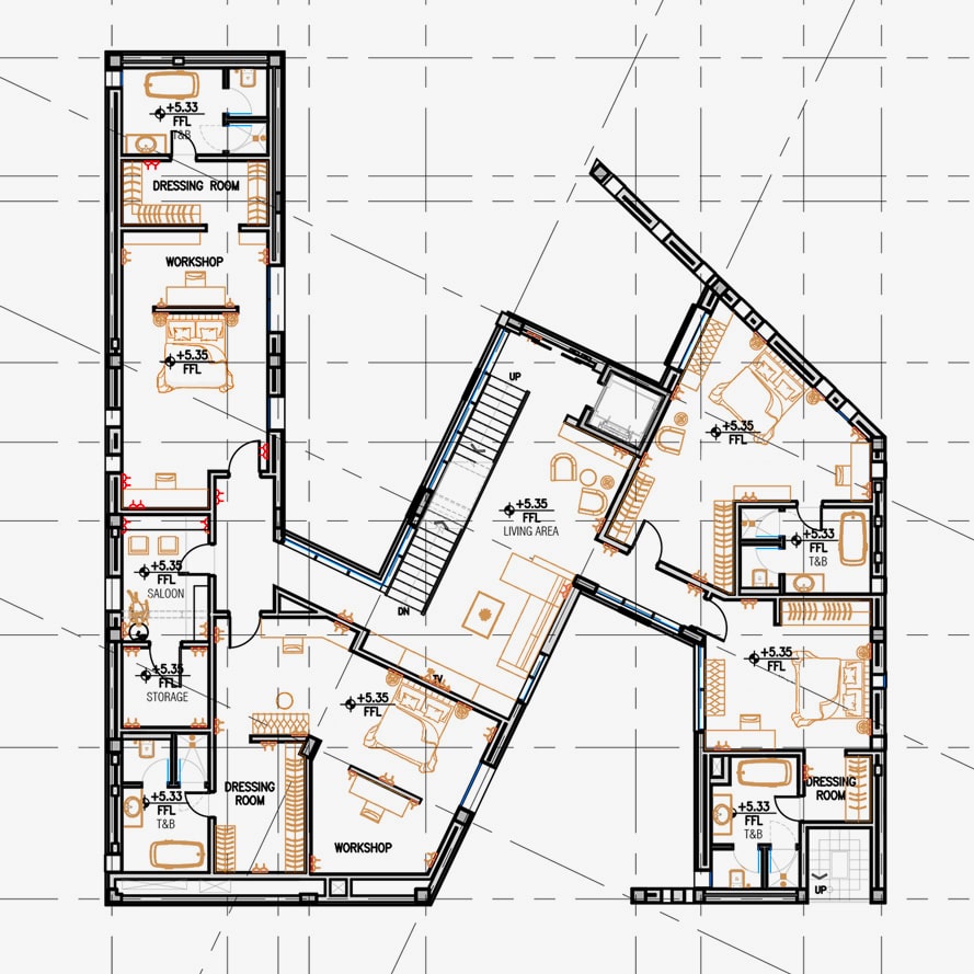 The distribution of the rooms of this large villa is quite complicated. Each floor alternates shared spaces for the family and their guests.