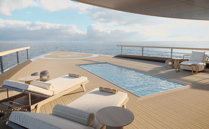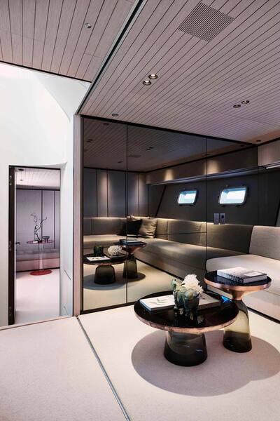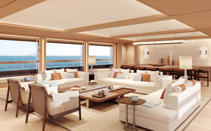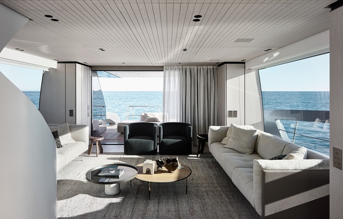 The design features a seamless flow between indoor and outdoor spaces, emphasising the unique layout of the yacht.