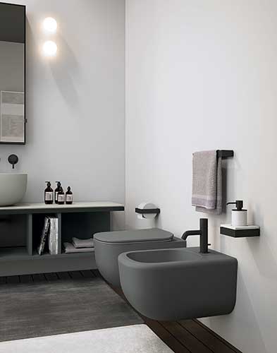 Each collection is rich in variation to satisfy any design need. Era, for example, is a bathroom furniture collection designed by Luca Cimarra, available in multiple versions. Wall-hung and countertop washbasins, urinals, and sanitary ware make up this versatile line.