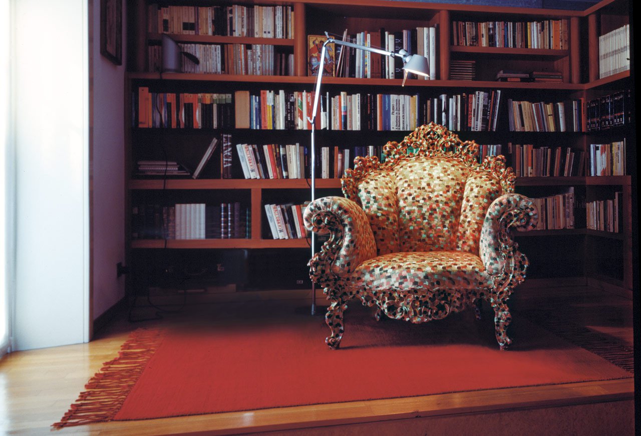 One of the most iconic of 20th century Italian furniture design is the handcrafted and hand-painted 1978 Proust armchair by Alessandro Mendini. Mendini reinterpreted existing designs with updated features. The wooden frame was hand-carved and hand-painted as well as the matching multicolor fabric upholstery covering the cushions. This becomes like a work of art, with the painting extended to the frame.