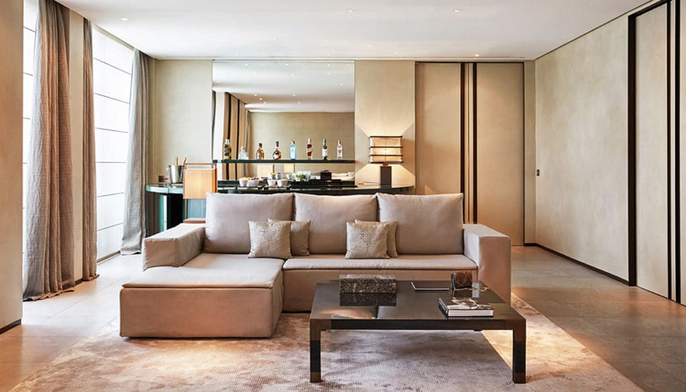 Taken from the Armani/Casa collection, the furnishings in the hotel share the signature design philosophy but have been tailored to reflect the mood of the palazzo. Elegant linear sofas covered in sophisticated fabrics sit aside backlit wooden bed heads in rooms clad with Silk Georgette, a smooth limestone from Asia. Meanwhile, on the seventh and eighth floors, where all the public areas are concentrated, the Armani/Lounge boasts a double height ceiling and views over the skyline.