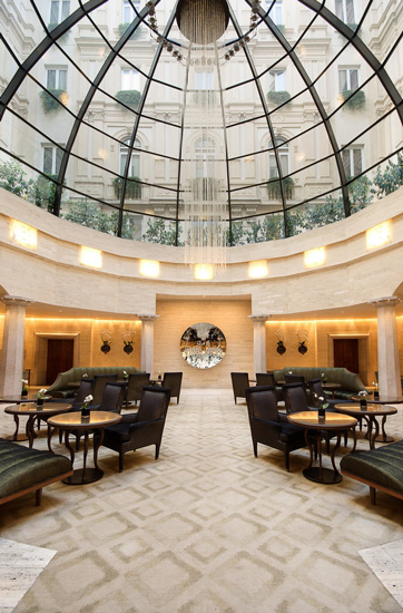 Milanese taste meets Parisian finesse at the Palazzo Parigi Hotel & Grand Spa located in the heart of Milan, in Corso di Porta Nuova. The hotel’s meticulous detail is the work of architect Paola Giambelli, who collaborated with world-renowned French interior designer, Pierre Yves Rochon. Upon entry, a wrought-iron skylight illuminates the hotel’s lobby, an elegant space in typical neoclassical Milanese style featuring a venetian mosaic flooring, hand-decorated ceilings, and a majestic staircase decorated in peach blossom marble and calcutta gold.