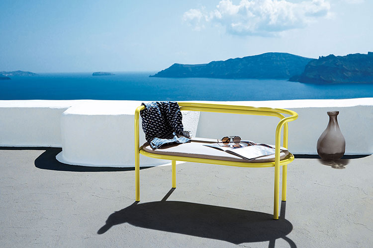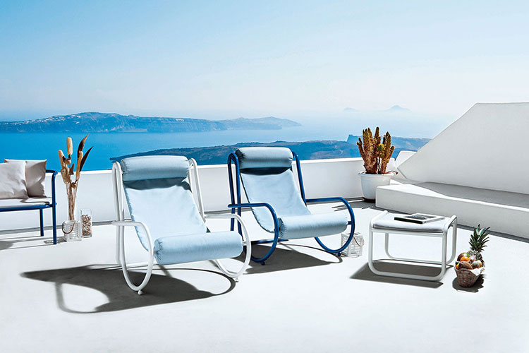 Brand of excellence that creates high quality outdoor products. From chairs to kitchens up to furniture accessories suitable for outdoor use. The exclusive Exteta collections include the Locus collection, a re-edition of a 1964 project designed by Gae Aulenti. Armchairs, sun loungers, tables, stools, deck chairs and sofas. A complete patio set, characterized by a sinuous coloured steel structure and fancy fabrics.