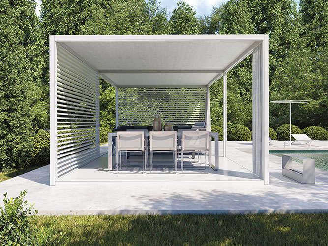 This is evident for example in the modular pergola system, a contemporary version of the wooden pergola. Ideal for extending a living space and creating outdoor dining areas, relaxation areas or shaded shelters. Pergola has an anodized aluminum structure and can be customized in various finishes, materials, colors and closing systems.