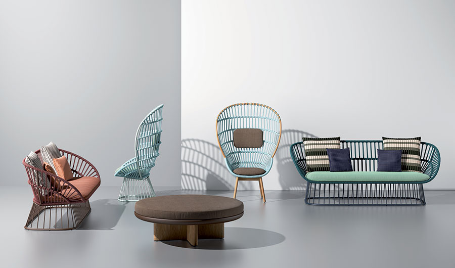 Among the top products is the Canasta collection designed by Patricia Urquiola in 2007 and now an icon in outdoor furniture. A collection composed of circular and linear sofas, armchairs, chairs and elements characterized by a large white polyethylene fiber weave completely handmade through a complex process that requires 4 hours of work and 2 craftsmen to string the yarn on the structure.