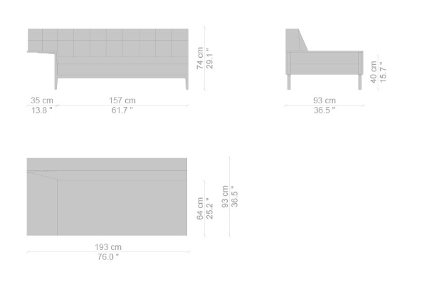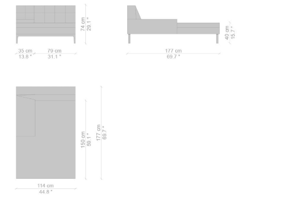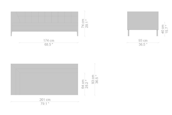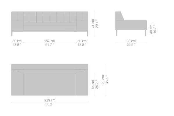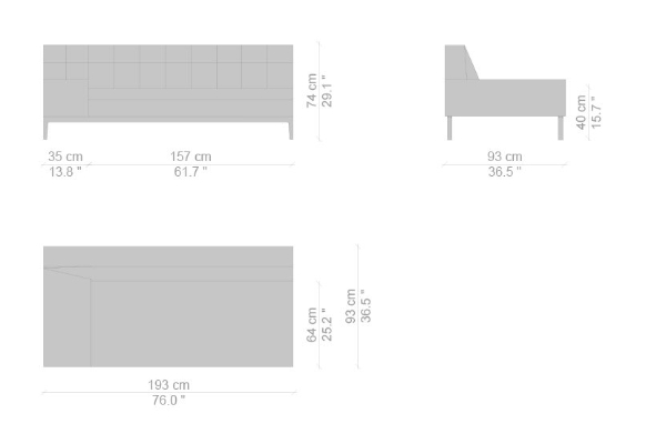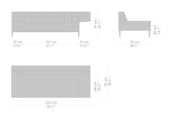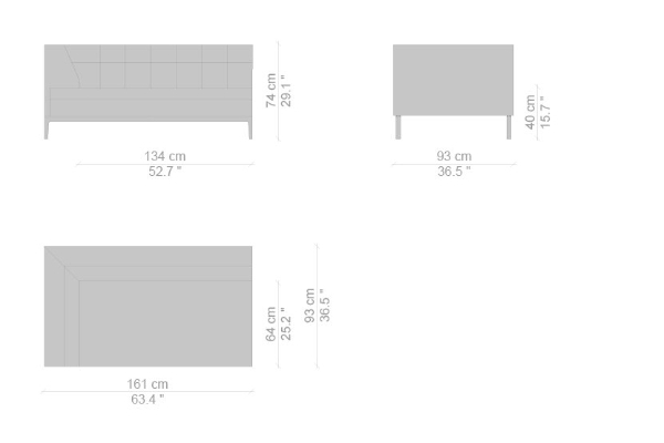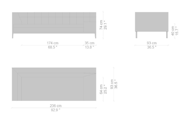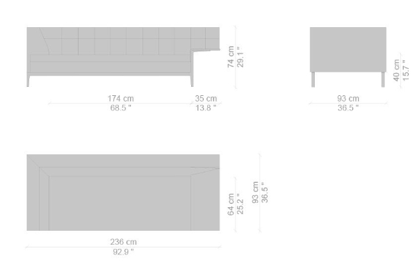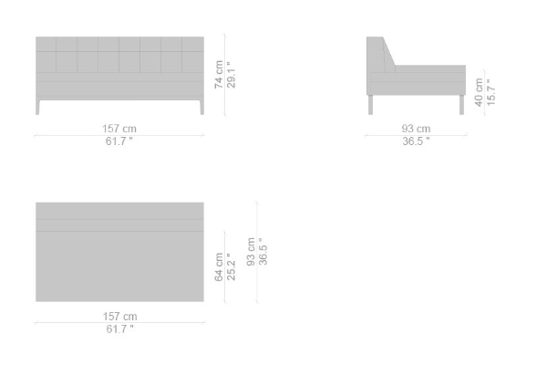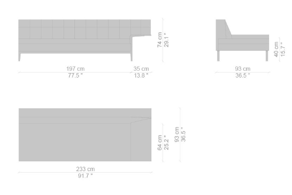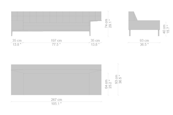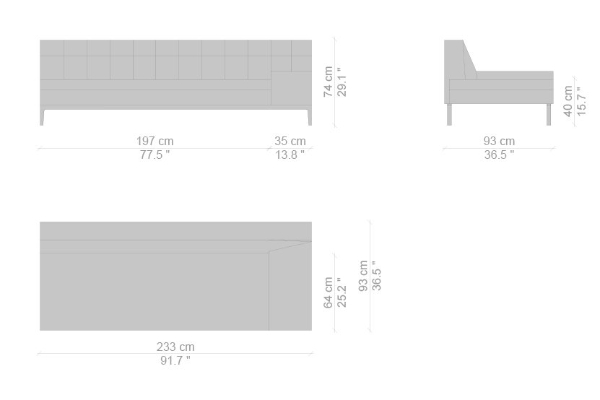 There are several variants of the Cassina Volage Ex-S Sofa, making it a versatile piece of furnishing that can accommodate your needs. There is a version that has massive armrests which measure 93x157x74 cm. Another variant of the Ex-S has slim armrests with supplemental round pillows at each side, this version measures 93x167x74 cm. A version with side tables is also available. This variant can have a side table on either side or both sides as well which measures 93x157x74 cm. Sectional sofas and poufs are included in the Ex-S line as well.