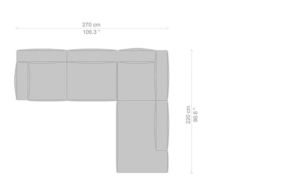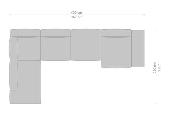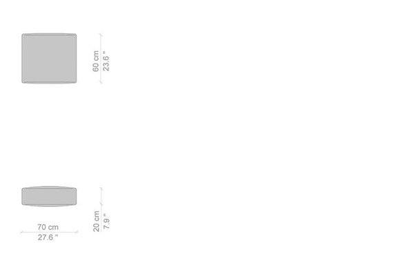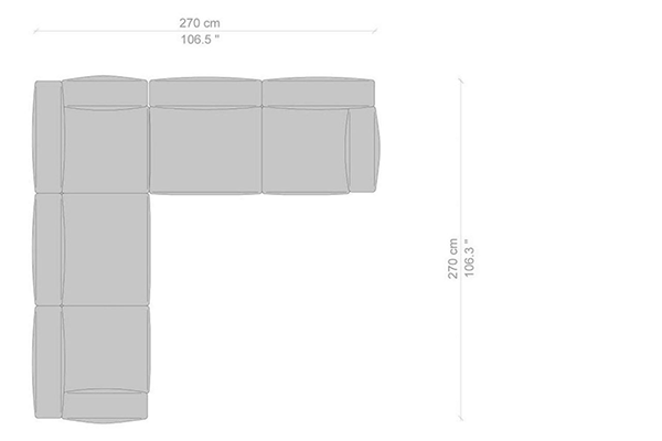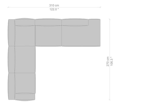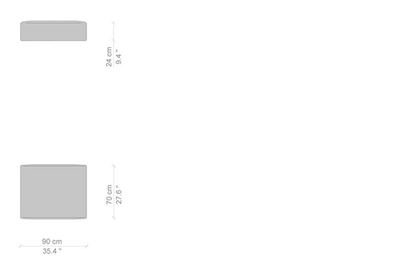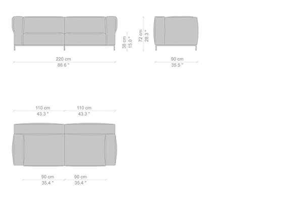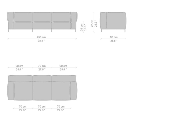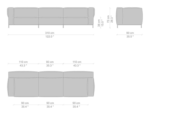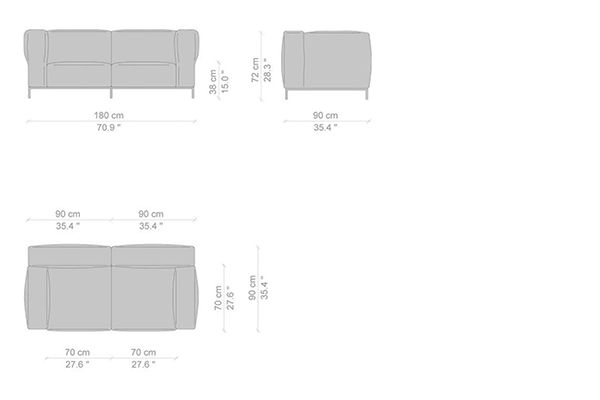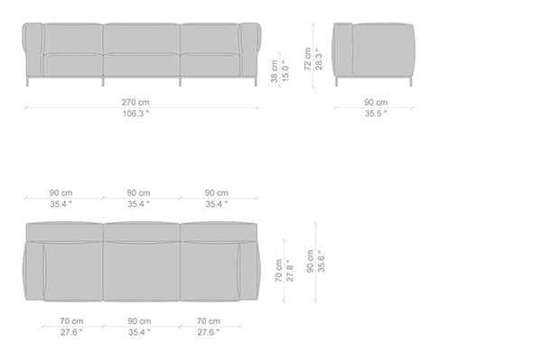 Cassina's Mex-Hi Sofa has five linear measurements for the basic version of this sofa system. These dimensions are: 90x180x72 cm, 90x220x72 cm, 09x250x72 cm, 90x270x72 cm, and 90x310x72 cm. Other configurations are also available for the Mex-Hi. These other variants fit within bigger domestic settings but are more suited for larger venues such as hotel lobbies or reception areas of buildings. These configurations can consist of any component within the Mex-Hi range, and any information regarding the sizes and modules available for this sofa system will be available upon request.