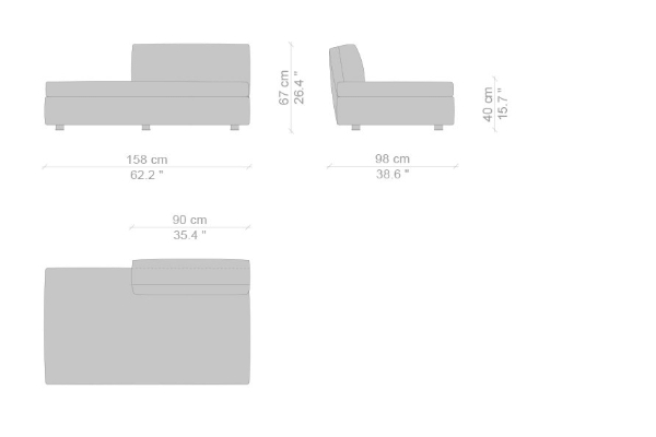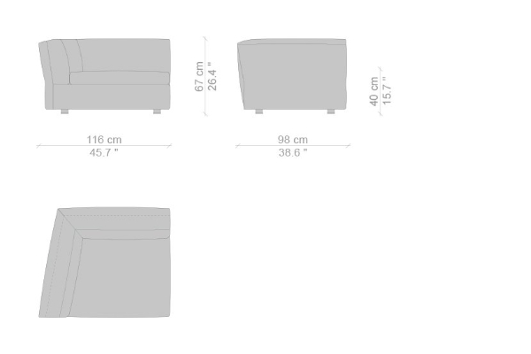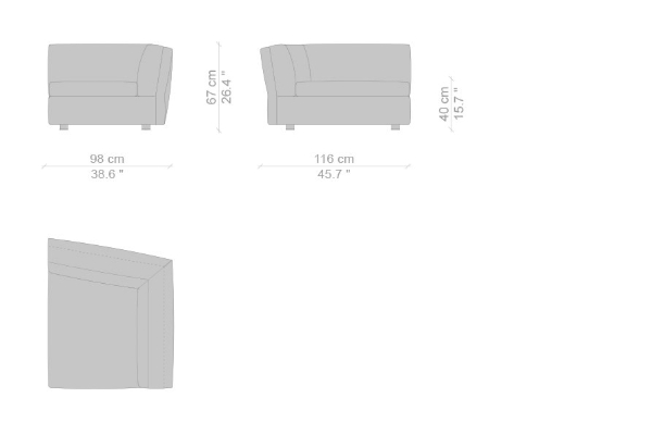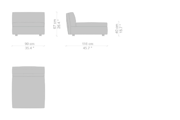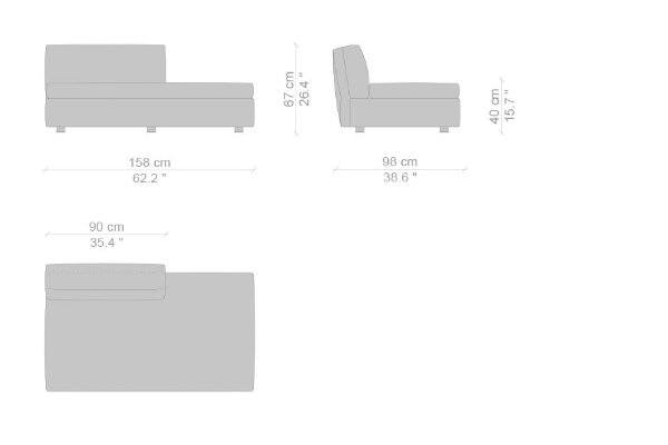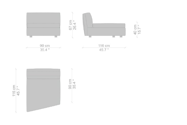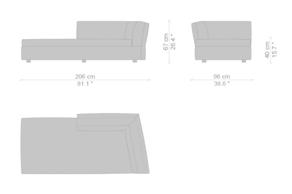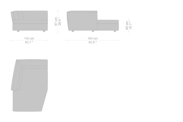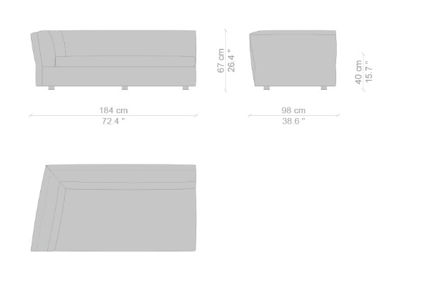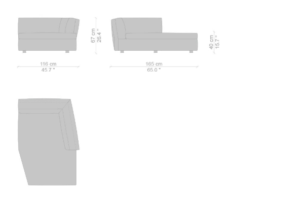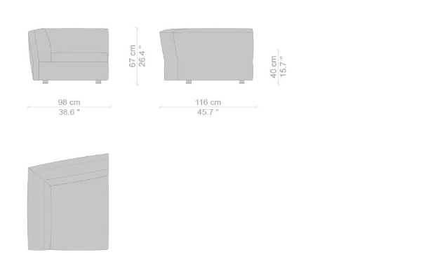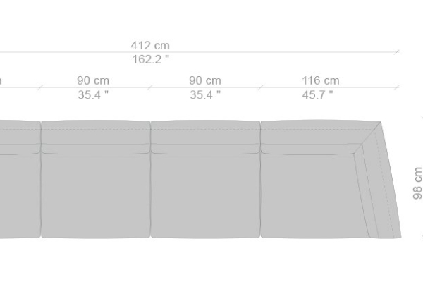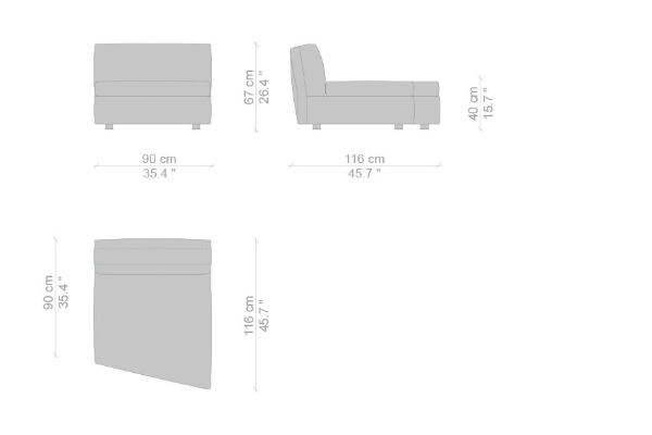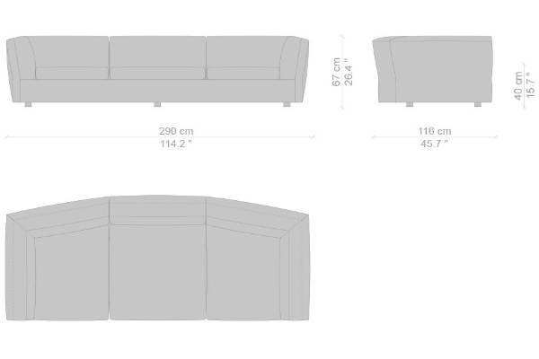 The Cassina Dress-Up Sofa is modular to an extent. The smallest base model with the open-tilt backrest/armrest measures 230x98x67. The model with parallel armrests and a seat depth of 116 cm measures 290x116x67 cm. There are sectional types as well. The base, two-part sectional sofa measures 165x300x67 cm with a seat depth of 98 cm while the biggest four-part sectional sofa comes in at 372x282x67 cm with a seat depth of 98 cm. These sectional types can be mixed and matched to form a sofa system that can accommodate your needs.