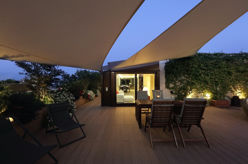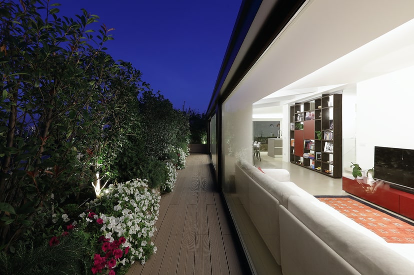 Seen in its concept for a contemporary penthouse in Milan, a night area on the lower floor, and a day zone on the upper floor that constantly brings in light from the large balcony that surrounds it.